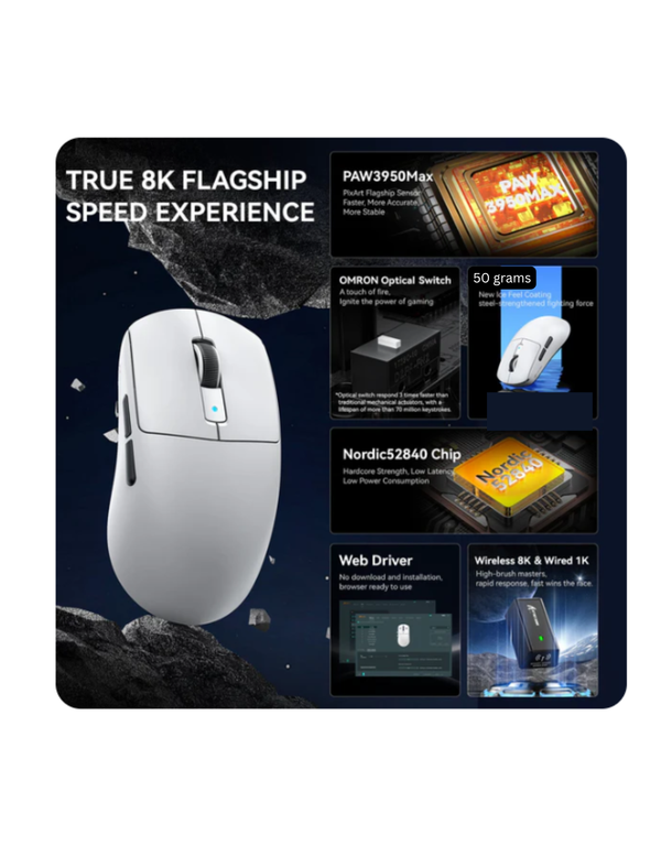 Meet the ultra-light 49 g powerhouse with the PixArt PAW3395 sensor and true tri-mode connectivity—because the mouse you choose matters just as much as the game you play.